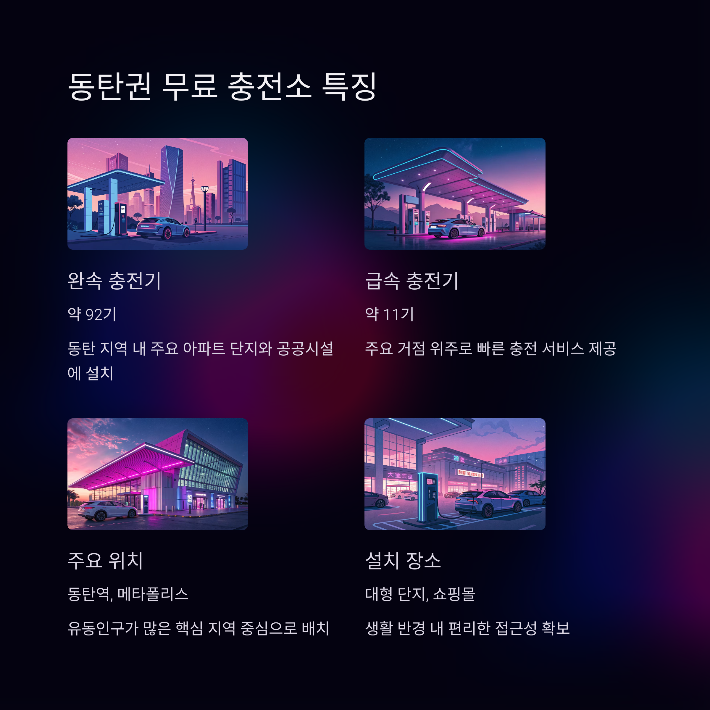 - 동탄호수공원 지하 – 완속 22기, 급속 3기